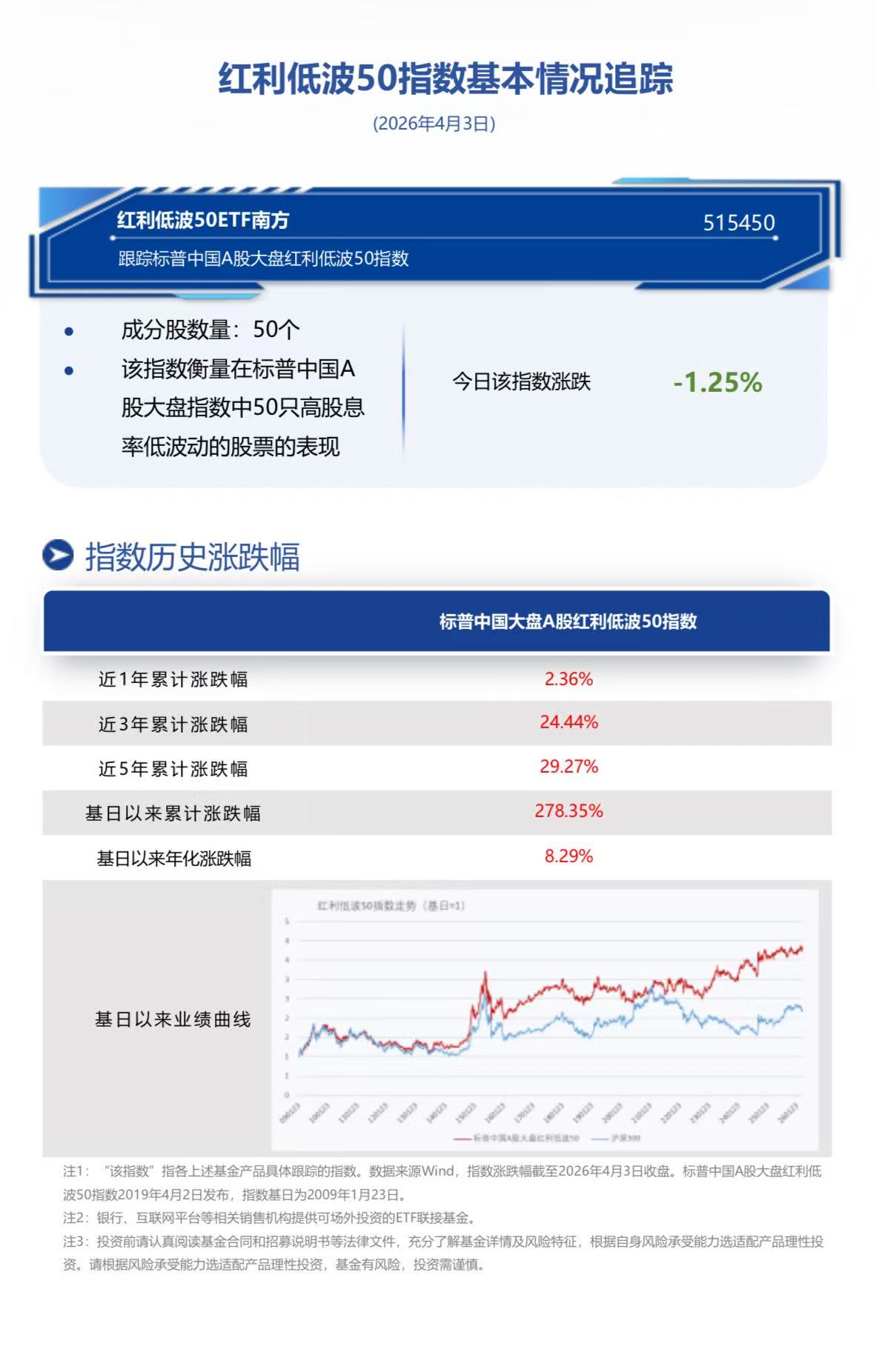 红利低波50ETF南方(515450.SH)跟踪标普中国A股大盘红利低波50指数,指数中在样本空间、行业分类等方面具备独特性,相比同类指数行业分布更加均衡、超配大消费板块,长期风险收益表现领先。截至2026年4月1日,据Wind,红利低波50股息率按整体法计算为4.45%,股息性价比仍存。
