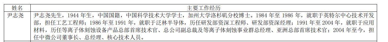 公开资料显示,尹志尧1944年生,中国科学技术大学学士,加州大学洛杉矶分校博士。1984年至1986年,尹志尧就职于英特尔中心技术开发部,担任工艺工程师;1986年至1991年,就职于泛林半导体,历任研发部资深工程师、研发部资深经理;1991年至2004年,就职于应用材料,历任等离子体刻蚀设备产品总部首席技术官、总公司副总裁及等离子体刻蚀事业群总经理、亚洲总部首席技术官。2004年至今,尹志尧任中微公司董事长、总经理、核心技术人员。