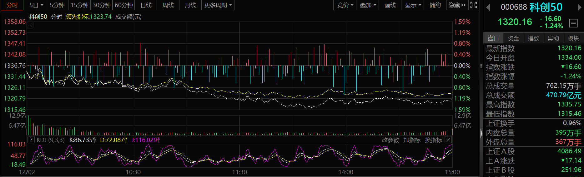 《科创板日报》20日讯,今日,科创50指数收跌1.24%,总成交额437.45亿元。盘面热点稀少,个股持续缩量。分行业来看,半导体、OCS等AI硬件方向涨幅居前,德科立涨超9%,腾景科技涨超6%,天岳先进、宏微科技涨超5%。锂电池、光伏等新能源赛道持续回调,华盛锂电跌超9%,大全能源跌超6%,天合光能跌超5%,芳源股份、派能科技等纷纷下挫。创新药板块涨跌不一,悦康药业涨超7%,前沿生物涨超5%,金迪克跌超8%,艾迪药业跌超6%。个股表现上,盐湖提锂概念股三达膜涨超13%。