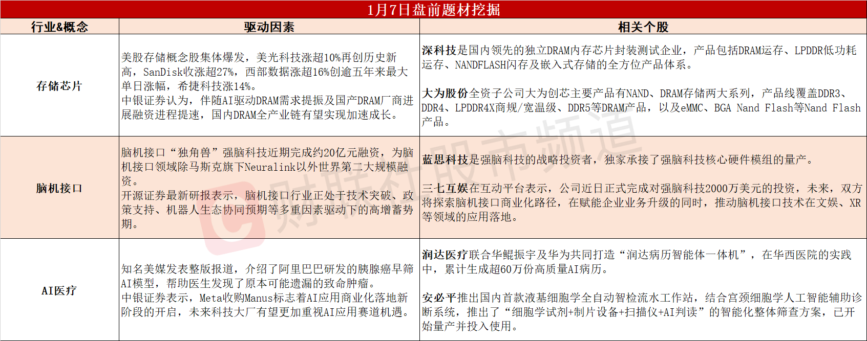 ①隔夜美股存储板块再度狂飙,存储产业链有望持续站上风口。②强脑科技近期完成约20亿元融资,脑机接口行业蓄势待发。③媒体整版报道阿里胰腺癌早筛AI模型,AI应用赛道投资机遇凸显。
