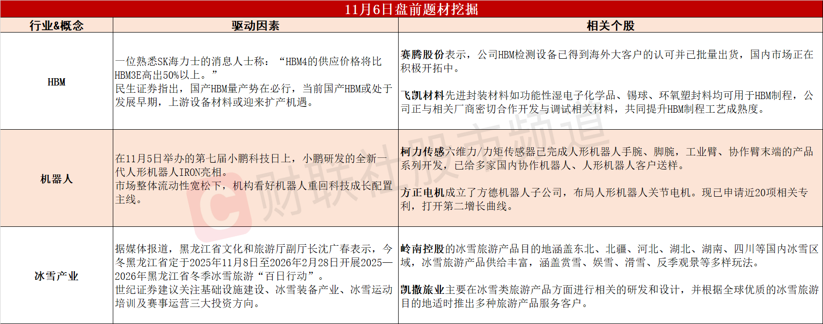 ①SK海力士的HBM4较上代涨价50%,HBM产业链或迎扩产机遇。②小鹏新一代人形机器人IRON亮相,机器人板块有望迎来密集催化。③黑龙江将开展冬季冰雪旅游“百日行动”,冰雪产业规模有望破万亿。