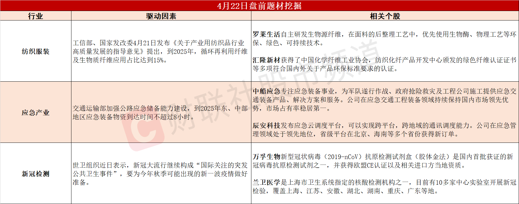 ①两部门推动生物质纤维应用,渗透率有望快速提升;②交通运输部加强公路应急储备能力建设,应急产业迎风口;③世卫专家称要为今秋出现新一波疫情做好准备,新冠检测需求居高不下。