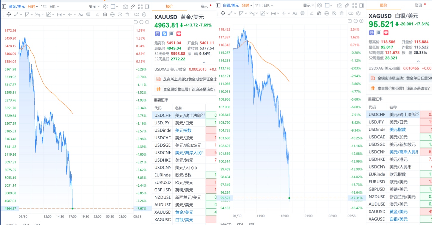 财联社1月30日电,国际金银价格直线下挫,现货黄金跌7.95%,报4949.62美元/盎司;现货白银跌16.93%,报95.86美元/盎司,最低触及95美元。现货白银这波创纪录的上涨行情被打破,此前的涨势令技术指标明显拉伸,本月一度累计上涨多达63%。北京时间今日上午,有报道称特朗普政府准备提名凯文·沃什担任美联储主席,这一消息提振美元并引发金属遭全面抛售。这位前美联储理事长期以来以“通胀鹰派”著称,但近几个月公开主张降低利率,以与特朗普的立场趋于一致。