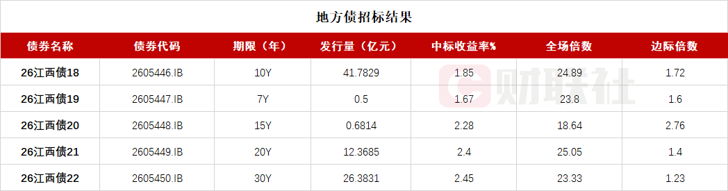 财联社4月23日电,按照此前公布的发行计划,国开行将于上午09:30-10:30和下午14:30-15:30招标发行六期金融债,分别为:2025年第十三期金融债券(第十四次增发),期限3年,发行量不超过20亿元,票面利率1.51%;2026年在上海清算所第四期金融债券(第十三次增发),期限7年,发行量不超过20亿元,票面利率1.94%;2026年第一期金融债券(第八次增发),期限1年,发行量不超过60亿元,票面利率1.51%;2026年第三期金融债券(第十三次增发),期限5年,发行量不超过80亿元,票面利率1.69%;2026年第五期金融债券(第十四次增发),期限10年,发行量不超过140亿元,票面利率1.92%;2026年在上海清算所第二期金融债券,期限3年,发行量不超过50亿元。