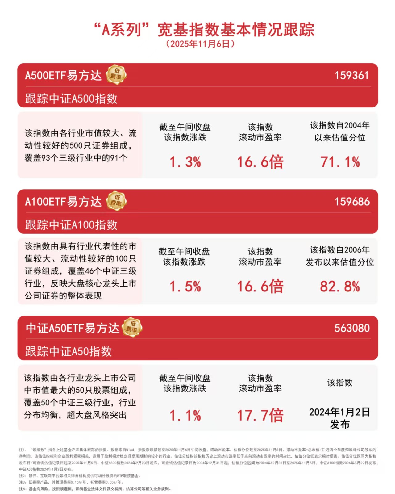 中证A500指数由各行业市值较大、流动性较好的500只股票组成,覆盖93个中证三级行业中的91个,从行业均衡视角反映A股各行业代表性公司的整体表现,其中信息技术、通信服务、医药卫生等新兴产业权重较高,兼顾“核心资产”与“新质生产力”。看好均衡宽基的投资者,可借道A500ETF易方达(159361)等产品加以配置。