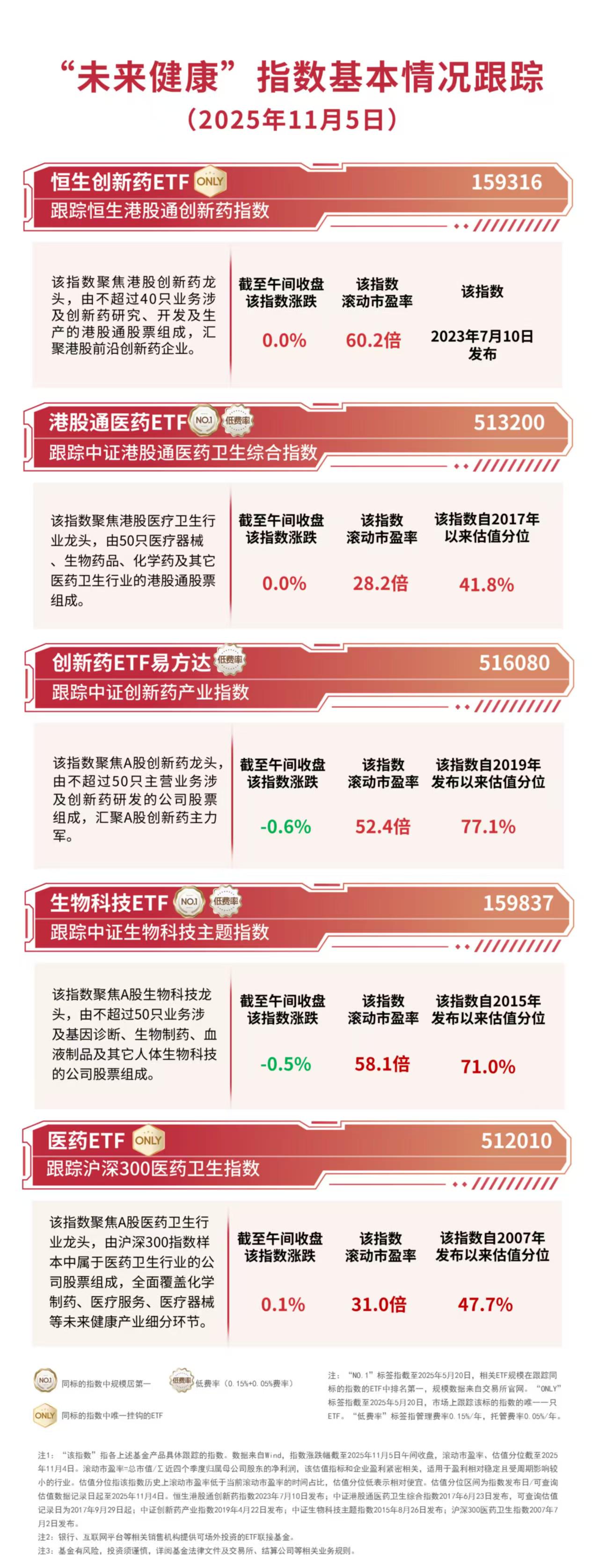 截至收盘,恒生港股通创新药指数下跌3.0%,中证港股通医药卫生综合指数下跌2.8%,中证创新药产业指数下跌2.3%,中证生物科技主题指数、沪深300医药卫生指数均下跌1.8%,资金逆势加仓,恒生创新药ETF(159316)和生物科技ETF(159837)全天净申购分别达4400万份和4000万份。