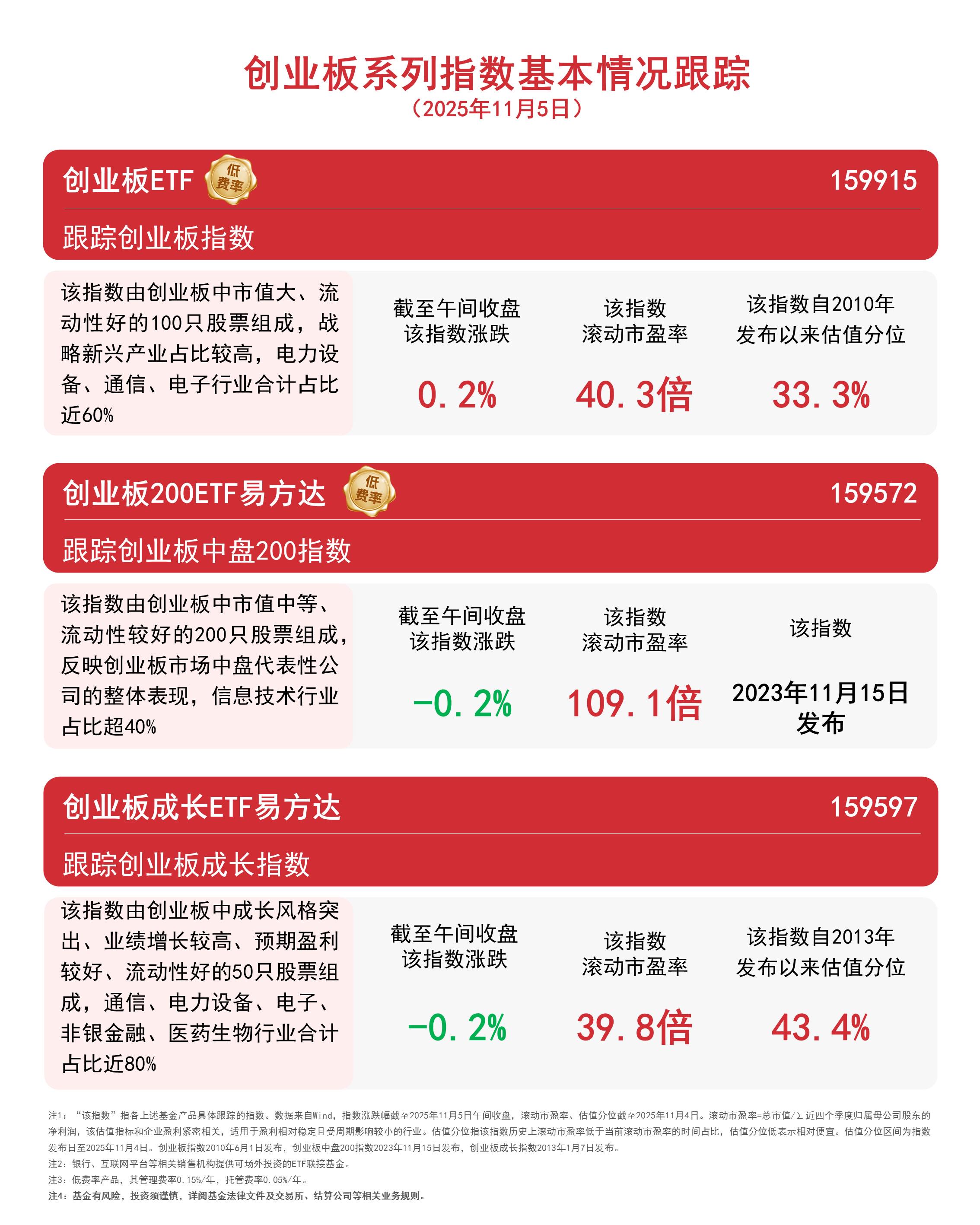 A500ETF易方达(159361)、创业板ETF(159915)、科创板50ETF(588080)分别跟踪以上指数,且均实行ETF中最低一档0.15%/年的管理费率,为投资者构建攻守兼备的投资组合提供了多样化选择。