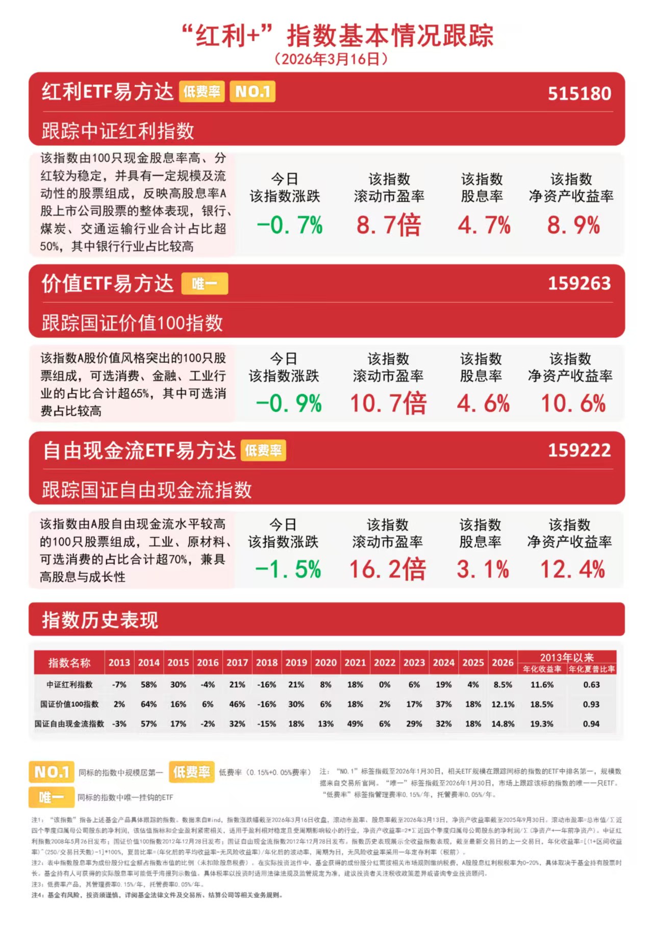 据悉,易方达基金是目前唯一一家红利类ETF全部实行0.15%/年管理费率的基金公司,可助力投资者低成本布局高股息资产。