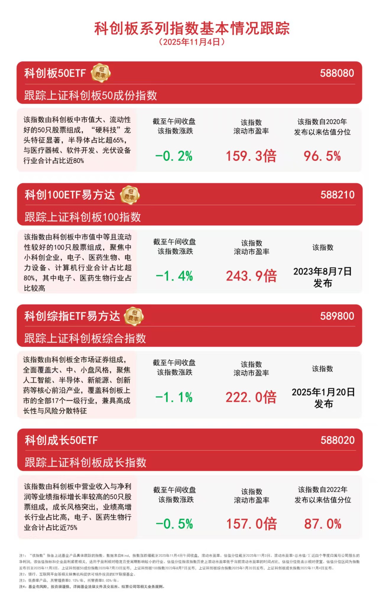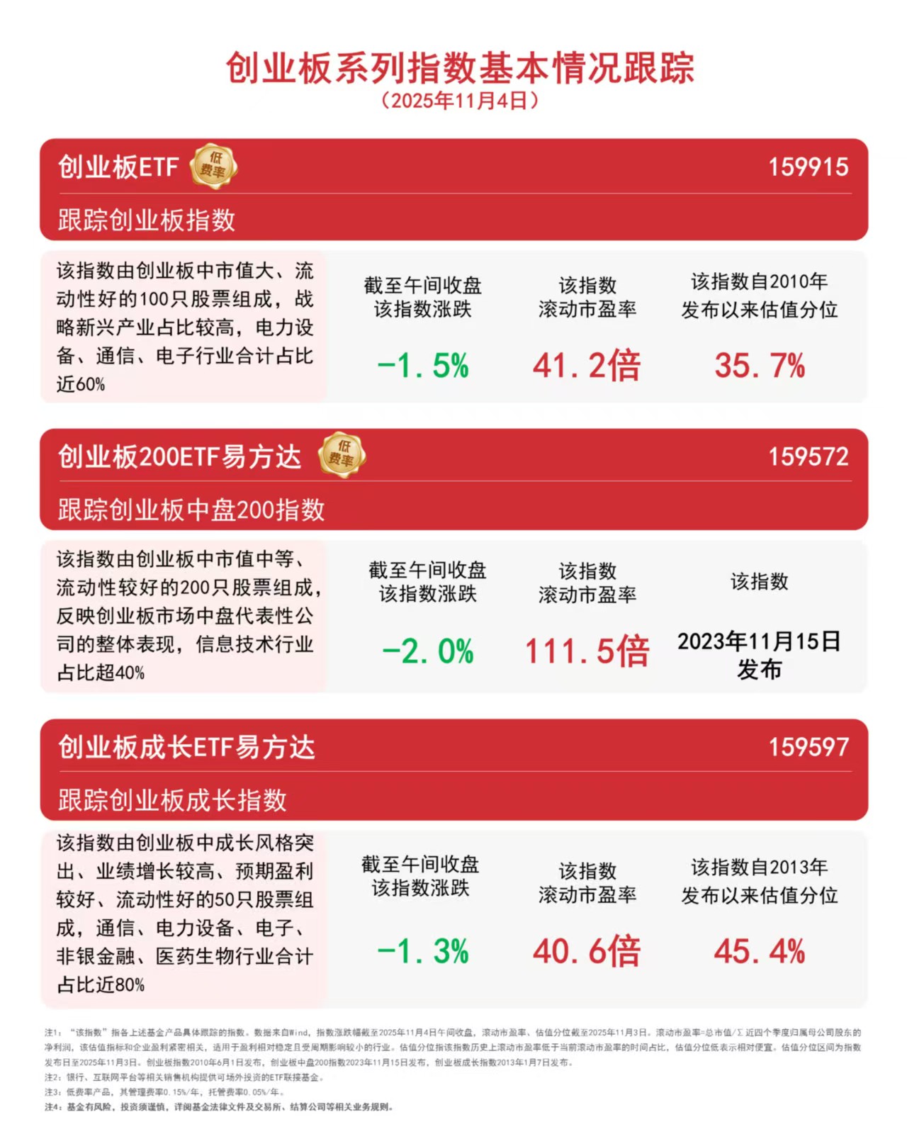 A500ETF易方达(159361)、创业板ETF(159915)、科创板50ETF(588080)分别跟踪以上指数,且均实行ETF中最低一档0.15%/年的管理费率,为投资者构建攻守兼备的投资组合提供了多样化选择。