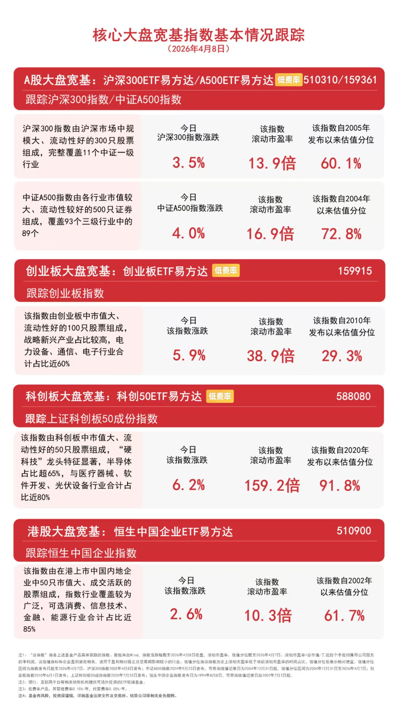 截至收盘,中证A500指数上涨4.0%,沪深300指数上涨3.5%,创业板指数上涨5.9%,上证科创板50成份指数上涨6.2%,恒生中国企业指数上涨2.6%。