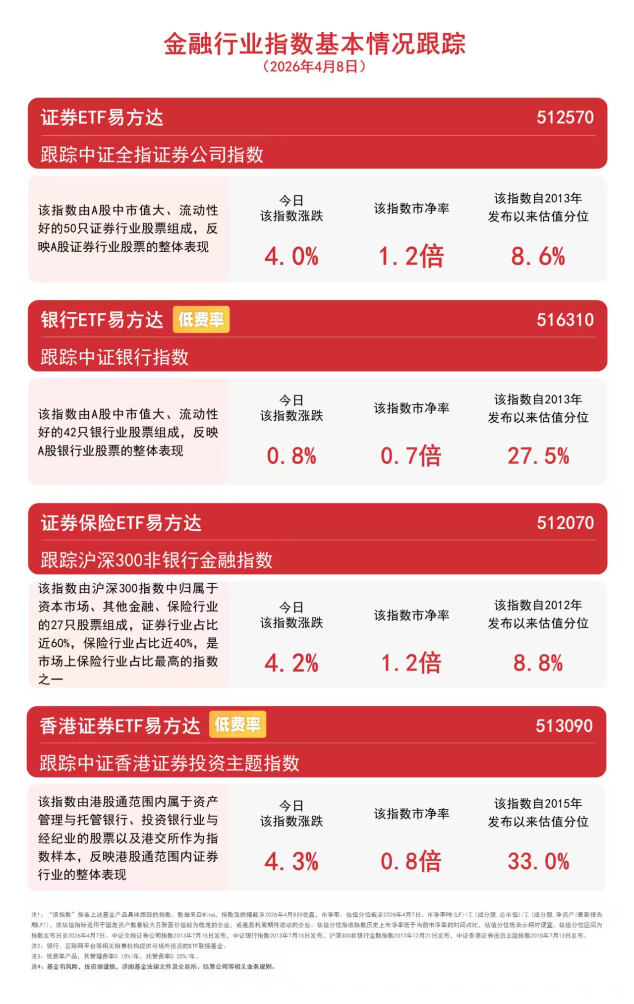 截至收盘,香港证券指数上涨4.3%,沪深300非银行金融指数上涨4.2%,中证全指证券公司指数上涨4.0%,中证银行指数上涨0.8%。相关ETF中,香港证券ETF易方达(513090)和证券保险ETF易方达(512070,联接基金A/C:000950/007882)成交额均较近日大幅放量。