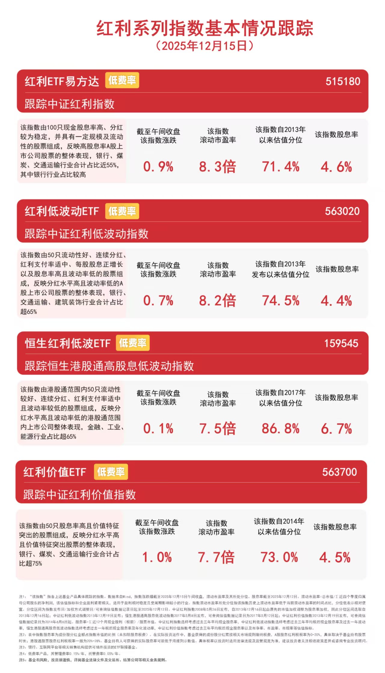 据悉,易方达基金是目前唯一一家红利类ETF全部实行低费率的基金公司,旗下恒生红利低波ETF(159545)、红利ETF易方达(515180)、红利低波动ETF(563020)、红利价值ETF(563700)、A500红利低波ETF(563510)等产品的管理费率均为0.15%/年,可助力投资者低成本布局高股息资产。