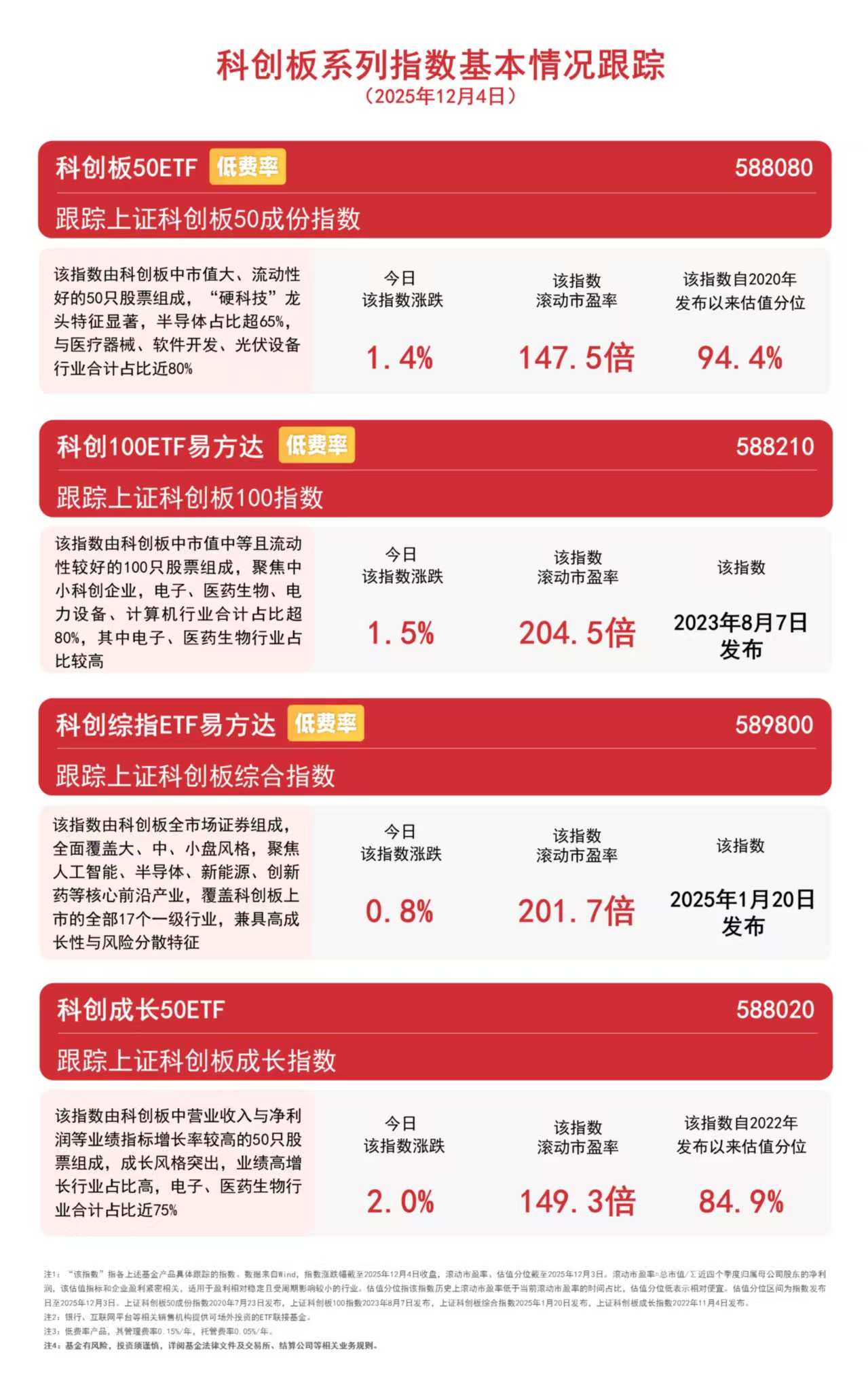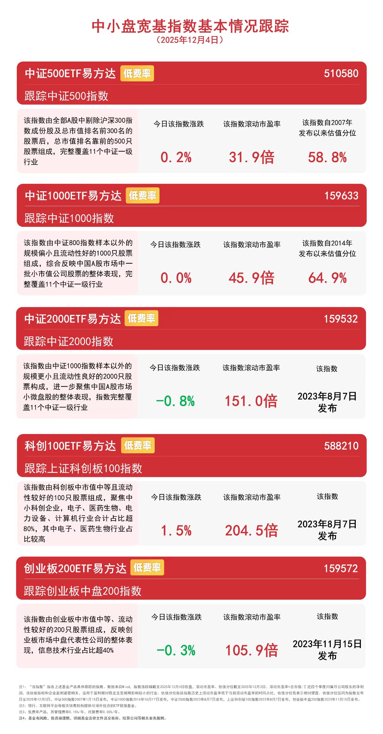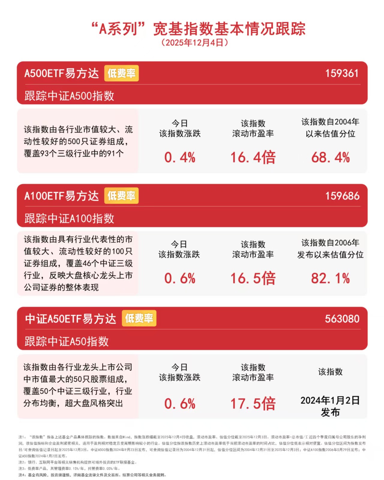 A500ETF易方达(159361)、创业板ETF(159915)的管理费率仅为0.15%/年,可助力投资者把握A股龙头企业高速发展机遇。