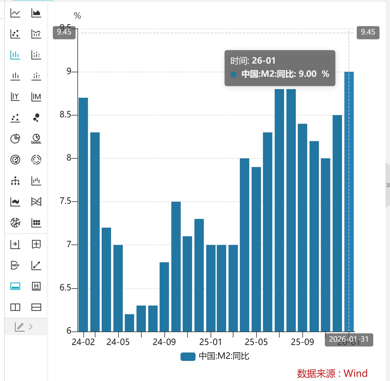 财联社2月13日电,央行发布的数据显示,1月末,广义货币(M2)余额347.19万亿元,同比增长9%,财联社C50风向指数调查预测中值为8.4%。狭义货币(M1)余额117.97万亿元,同比增长4.9%。流通中货币(M0)余额14.61万亿元,同比增长2.7%。1月份净投放现金5191亿元。