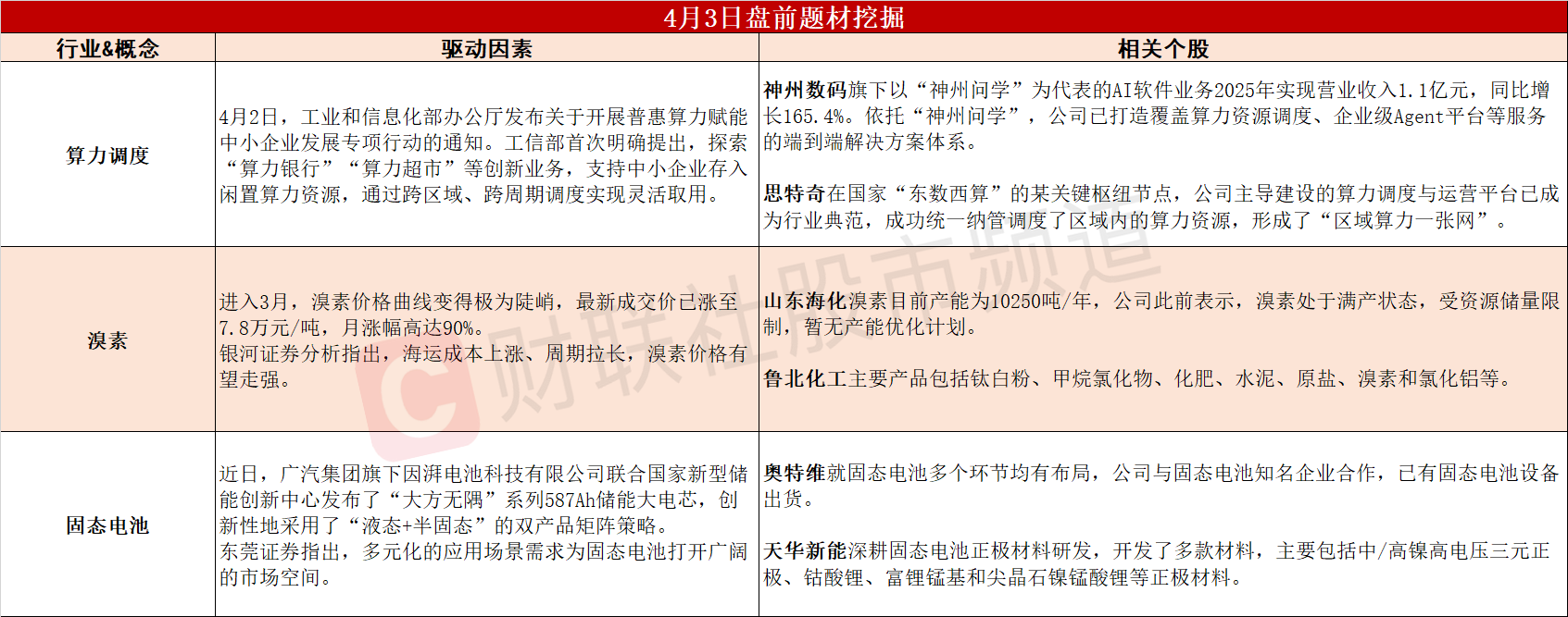 ①工信部首提“算力银行”“算力超市”,算力调度平台有望率先获益。②国内供给短缺叠加海外供应不畅,溴素价格3月涨幅高达90%。③多元化应用场景驱动,固态电池行业迎来技术迭代黄金机遇期。