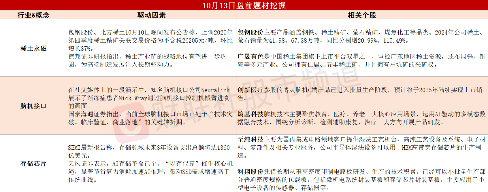 ①稀土巨头再度宣布提价,行业正呈现供需两端共振格局。②Neuralink展示“脑机接口+机器人”应用,机构称脑机接口市场前景可期。③存储领域未来3年设备支出将超1300亿美元,存储行业景气度有望持续攀升。
