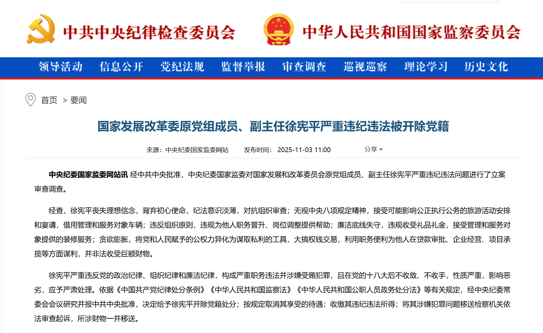 财联社11月3日电,据中央纪委国家监委网站3日消息,经中共中央批准,中央纪委国家监委对国家发展和改革委员会原党组成员、副主任徐宪平严重违纪违法问题进行了立案审查调查。